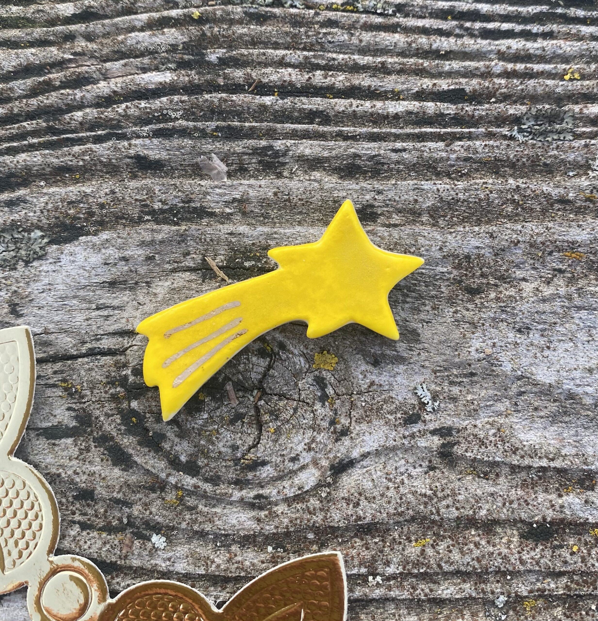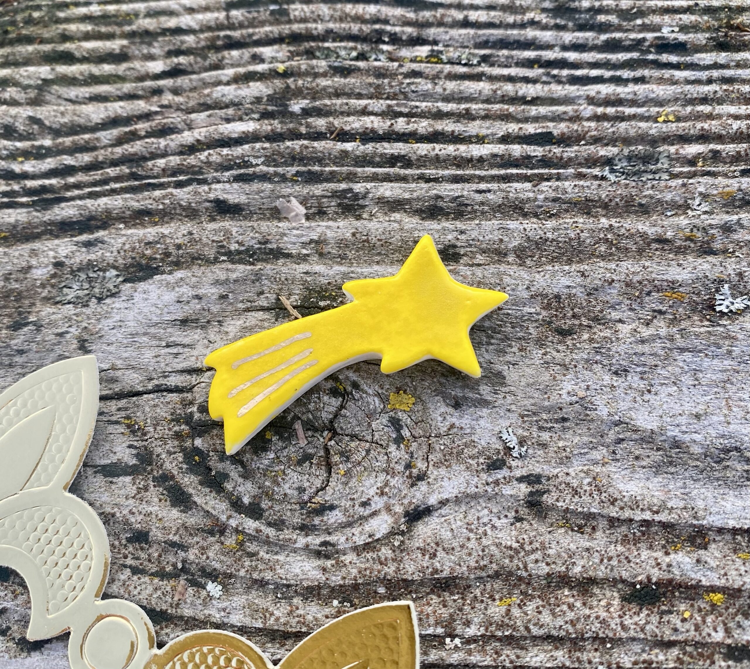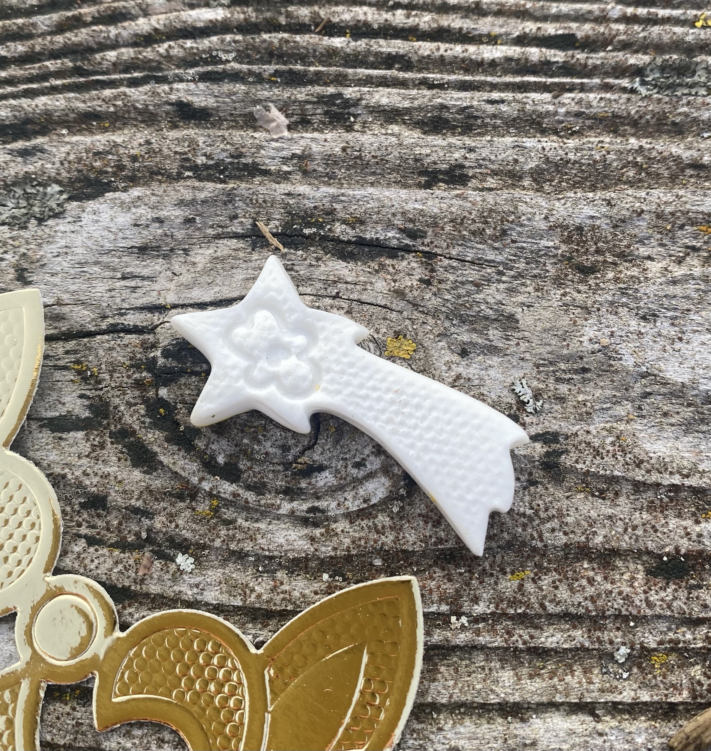 Il ne faut pas moins de 3 cuissons à des hautes températures pour réaliser cette fève : une première après le façonnage, une seconde pour l’émaillage et une troisième pour la pose de l’or pour l’écriture et le cœur .
