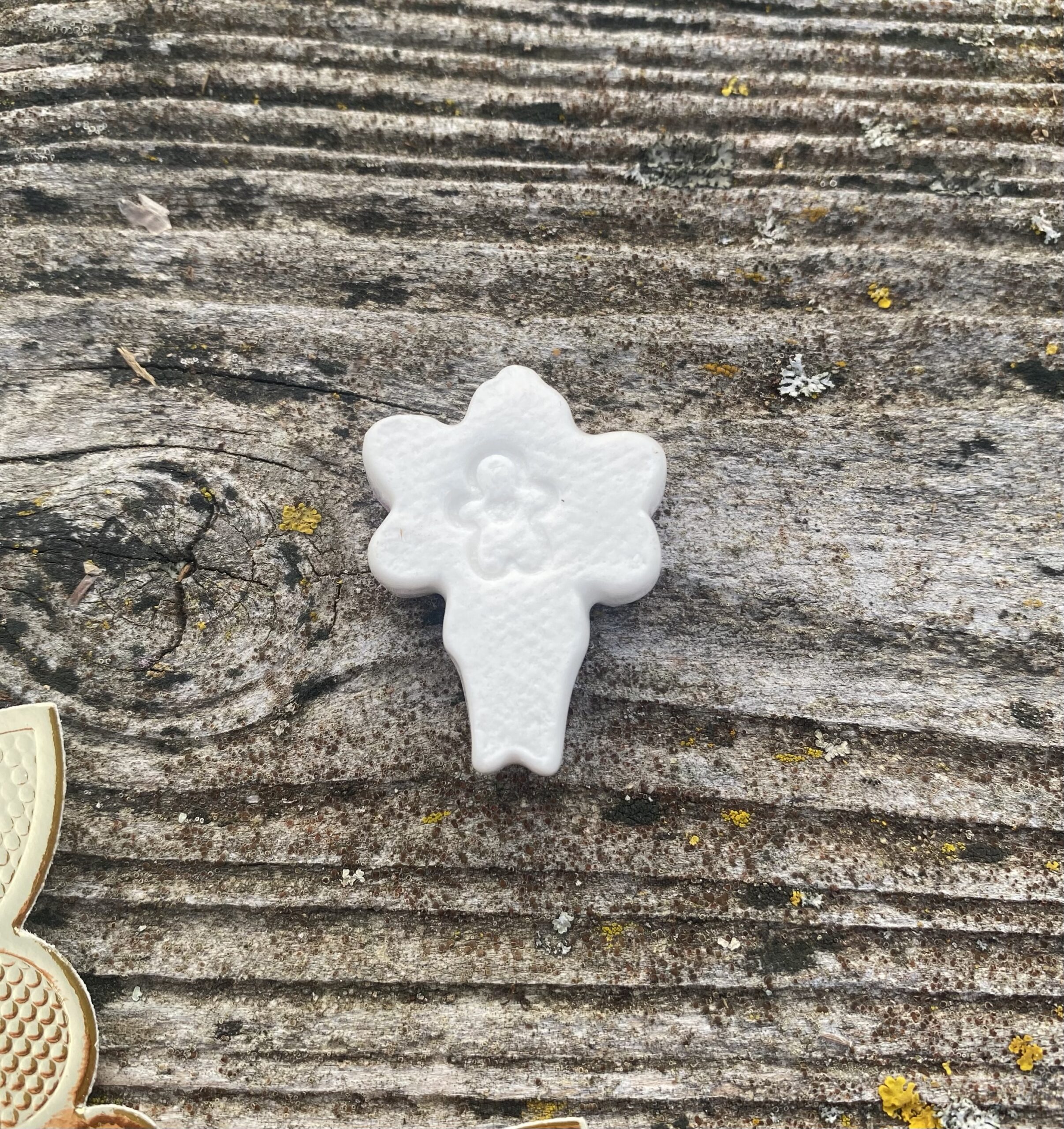 Il ne faut pas moins de 3 cuissons à des hautes températures pour réaliser cette fève : une première après le façonnage, une seconde pour l’émaillage et une troisième pour la pose de l’or pour l’écriture et le cœur .