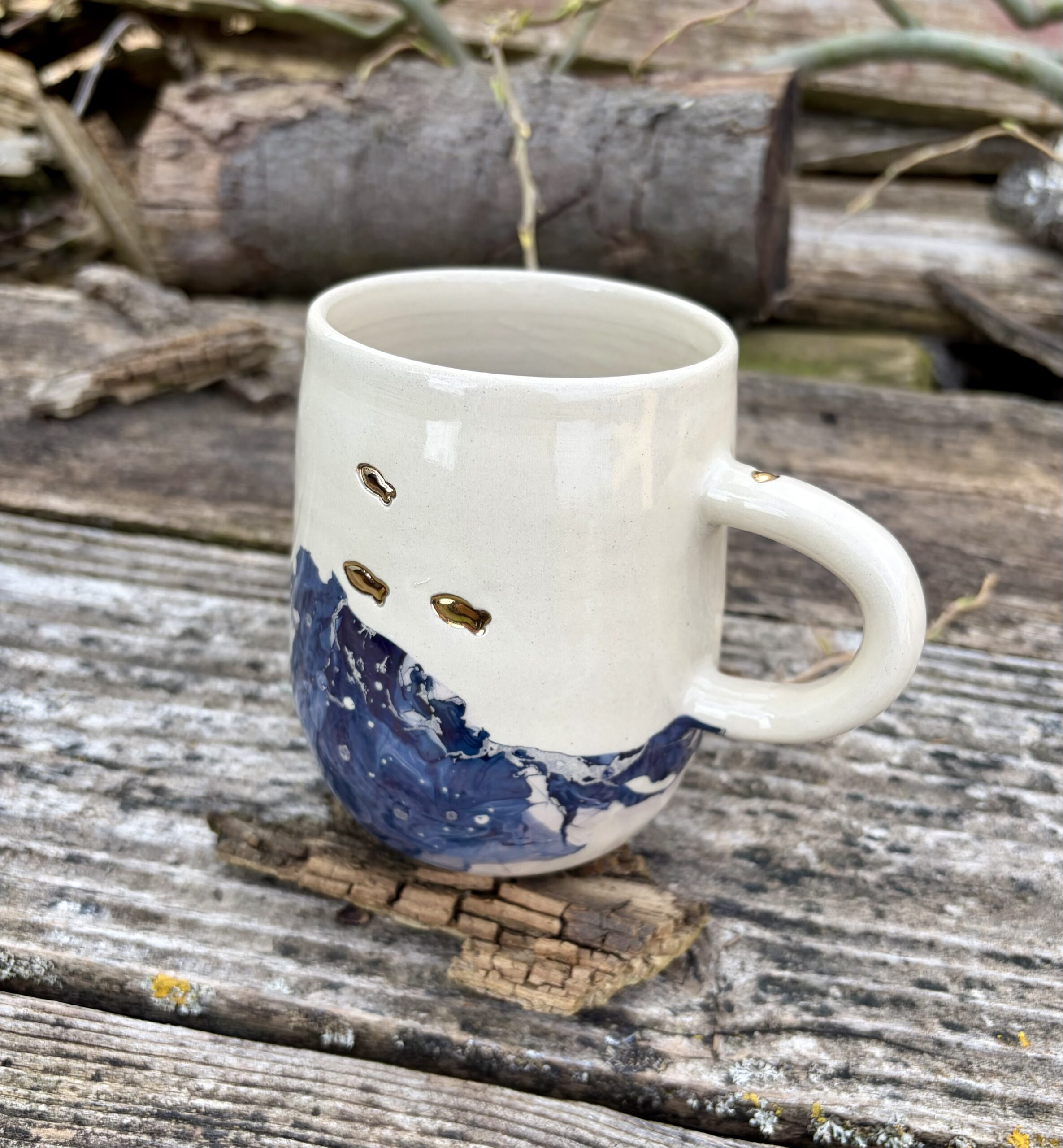 J’ai fabriqué ce mug en tournant du grès sur mon tour de potier, j’y ai ensuite ajouté l’anse puis il a patienté quelques jours durant lesquels il a séché tout doucement.