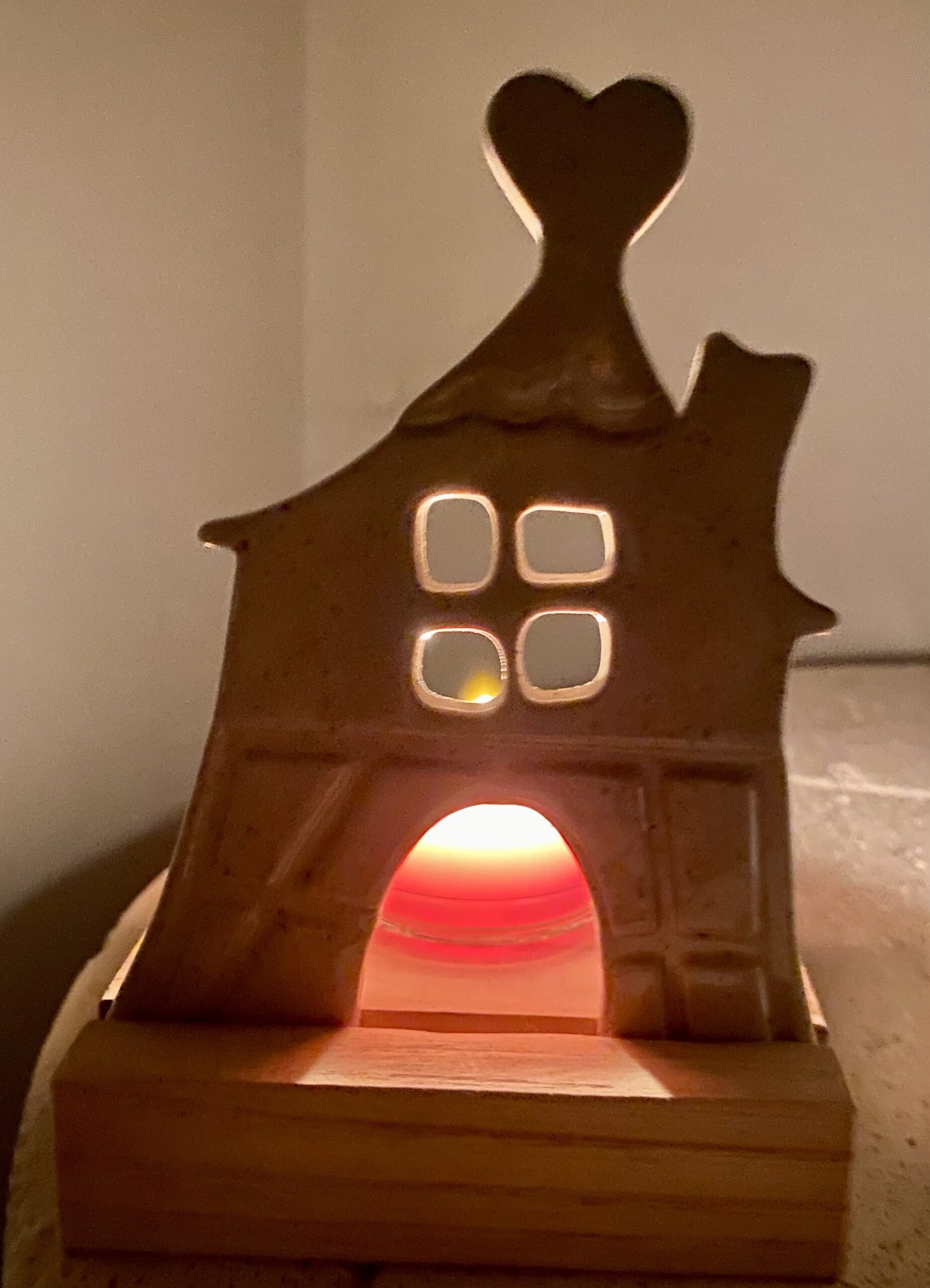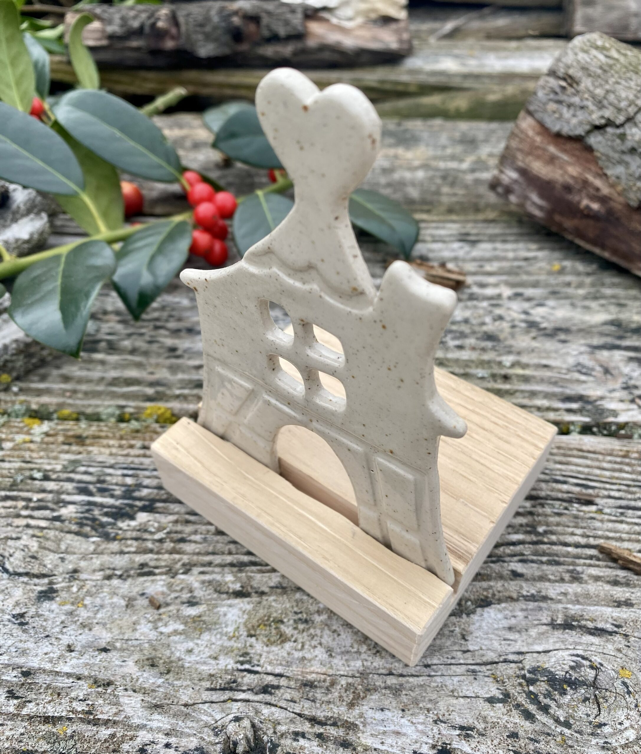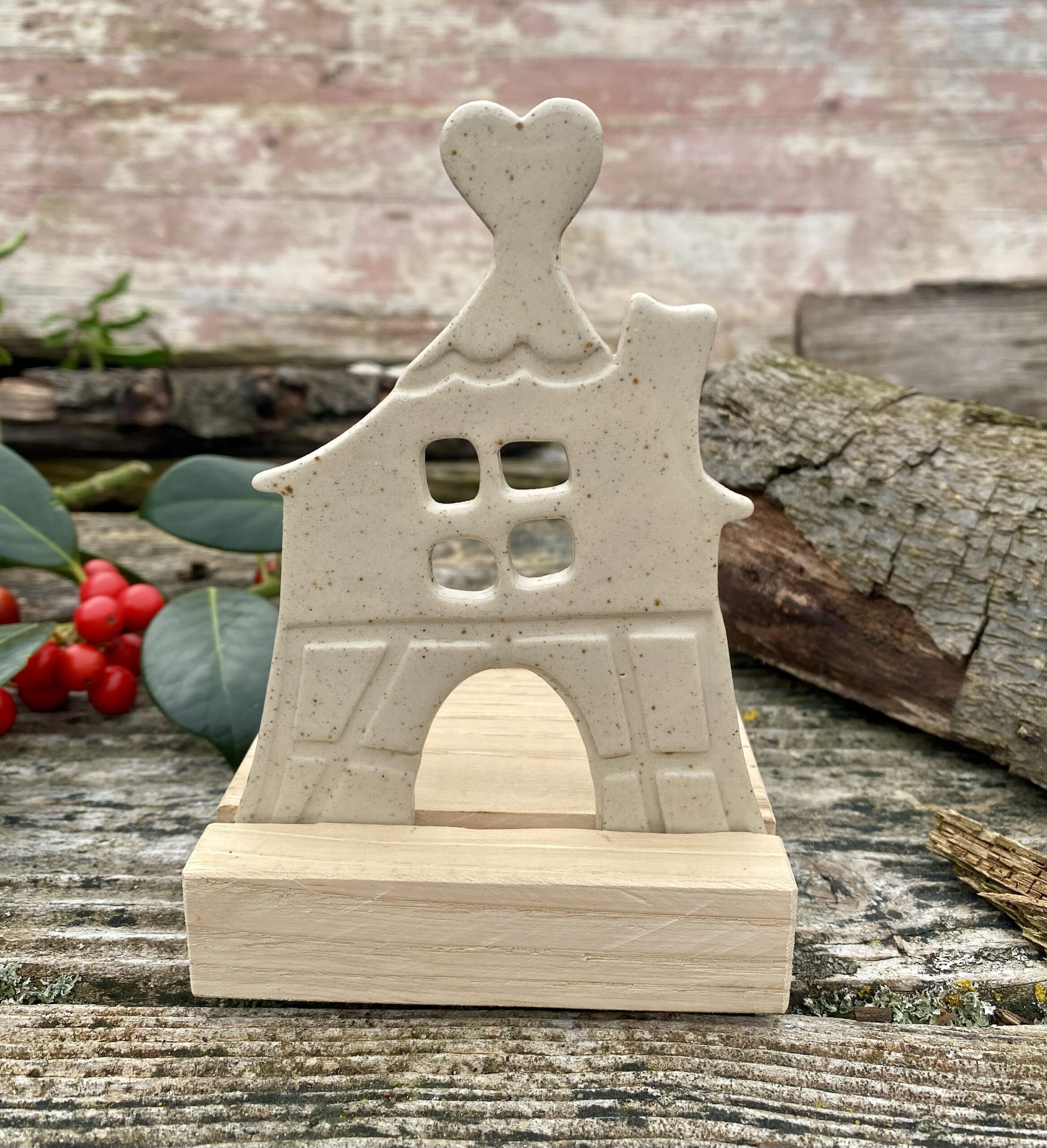 Chaque pièce a été réalisée avec soin et amour, en céramique. La maison est imbriquée dans une pièce de bois.